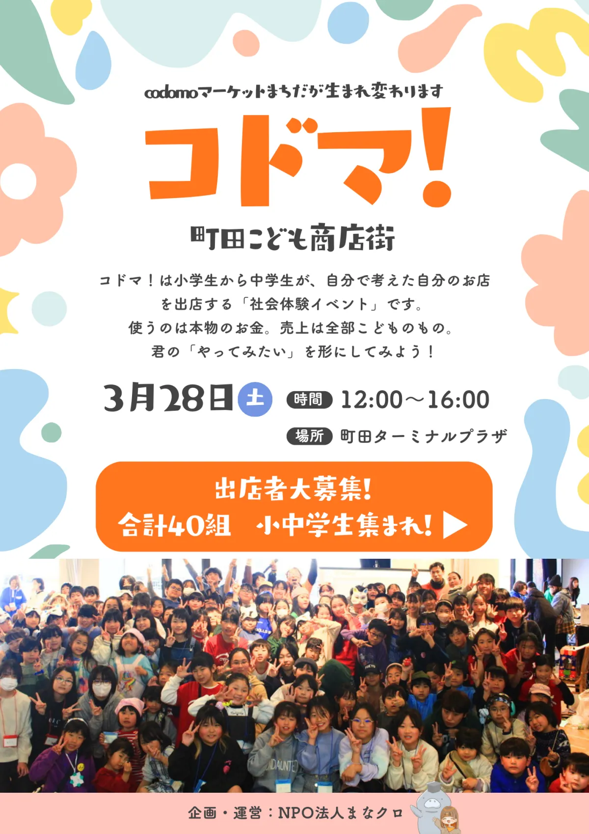 2026年3月28日、東京都町田市で「コドマ!〜町田こども商店街〜」が開催されます。このイベントは、小中学生が自ら考えた商品やサービスを販売する社会体験の場であり、本物のお金を使った本格的な商売体験ができます。主催はNPO法人まなクロ(代表理事:西山 絢)。現在、出店者を募集中で、申込締切は2026年2月15日です。