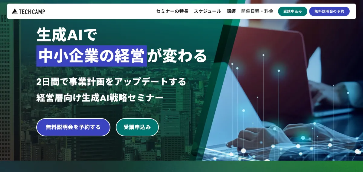 「テックキャンプ」は、未経験からのITエンジニア転職を目指す人向けのプログラミングスクールで、多くの受講生が成功を収めています。法人向けには、実践的な研修プログラムを提供しており、中小企業のDX(デジタルトランスフォーメーション)推進を支援しています。