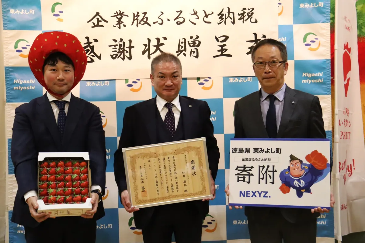 徳島県の東みよし町が、いちご産業の年中栽培を目指す新たなプロジェクト「にし阿波いちごタウンプロジェクト」を進めています。このプロジェクトは、企業版ふるさと納税を活用し、地域の活性化を図るものです。最近、株式会社NEXYZ.Groupの子会社、NEXYZ.ファシリティーズが同町への寄附を行い、贈呈式が行われたことが発表されました。