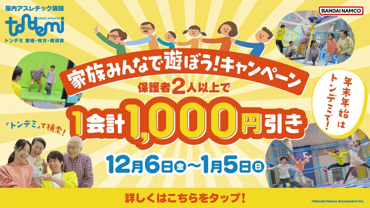 2024年12月から2025年1月にかけて、屋内アスレチック施設『トンデミ』で家族向けのキャンペーンが実施されます。この期間中、保護者が2人以上いる場合1会計あたり1,000円の割引が適用されます。このキャンペーンは、トンデミ愛媛、枚方、横須賀の3か所で行われ、冬の寒い日や雨の日でも心配なく遊ぶことができます。