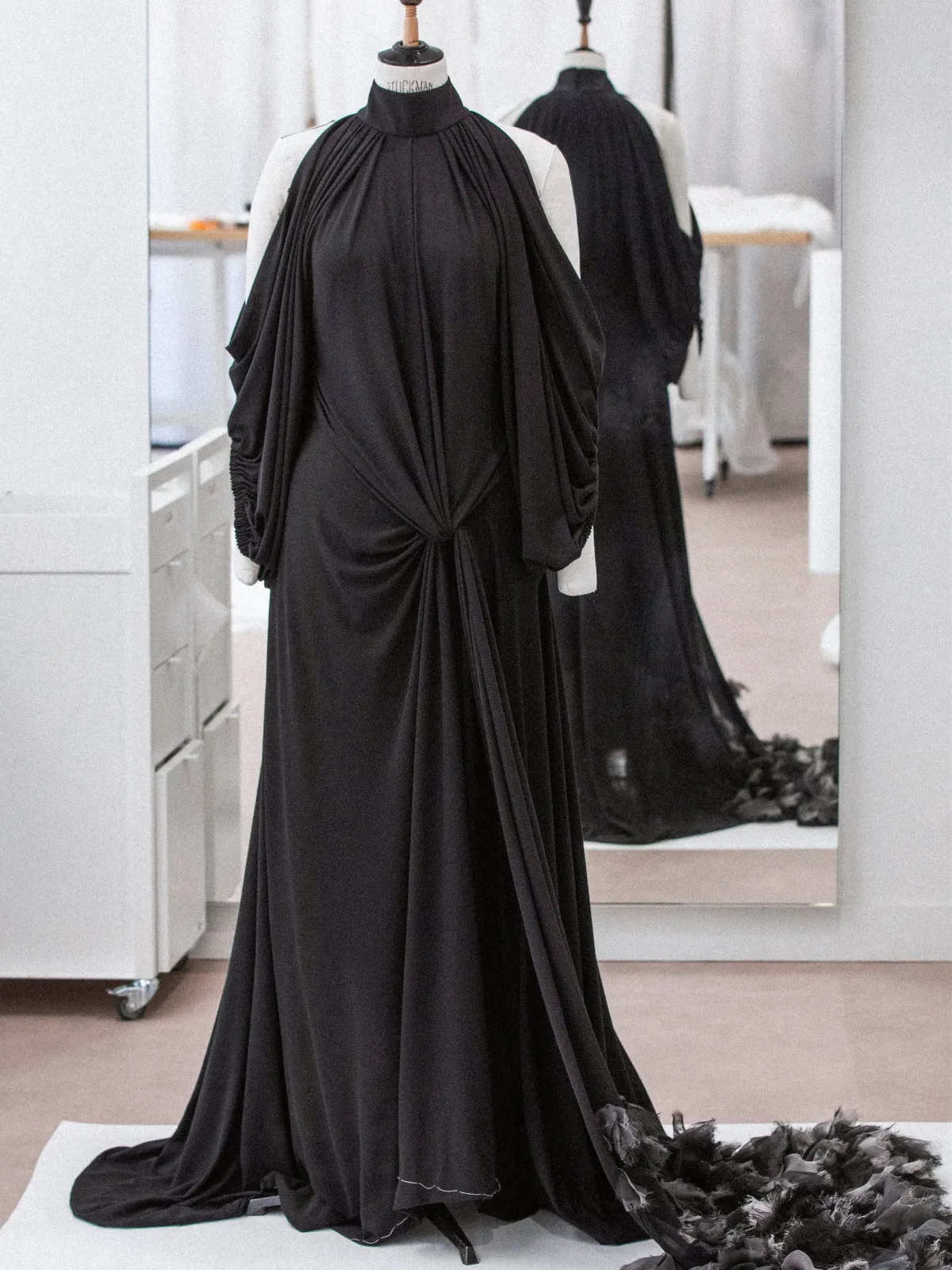 エセルが選んだのは、ウエストで結ぶデザインのブラックジャージードレス。シンプルながらも洗練されたこのドレスは、ロングパネルに施されたほつれ風の刺繍が印象的。視覚的な抜け感を演出しながらも、着る人の個性を引き立てるアイテムです。