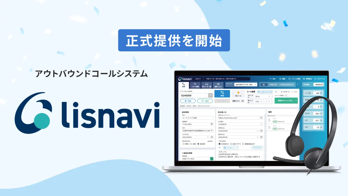 株式会社Scene Liveが2025年4月1日から新たに提供するアウトバウンドコールシステム『lisnavi(リスナビ)』は、電話営業の効率化に特化したサービスです。従来の『List Navigator.』に代わるこのシステムは、導入社数2500社を誇るScene Liveの実績を基にしています。