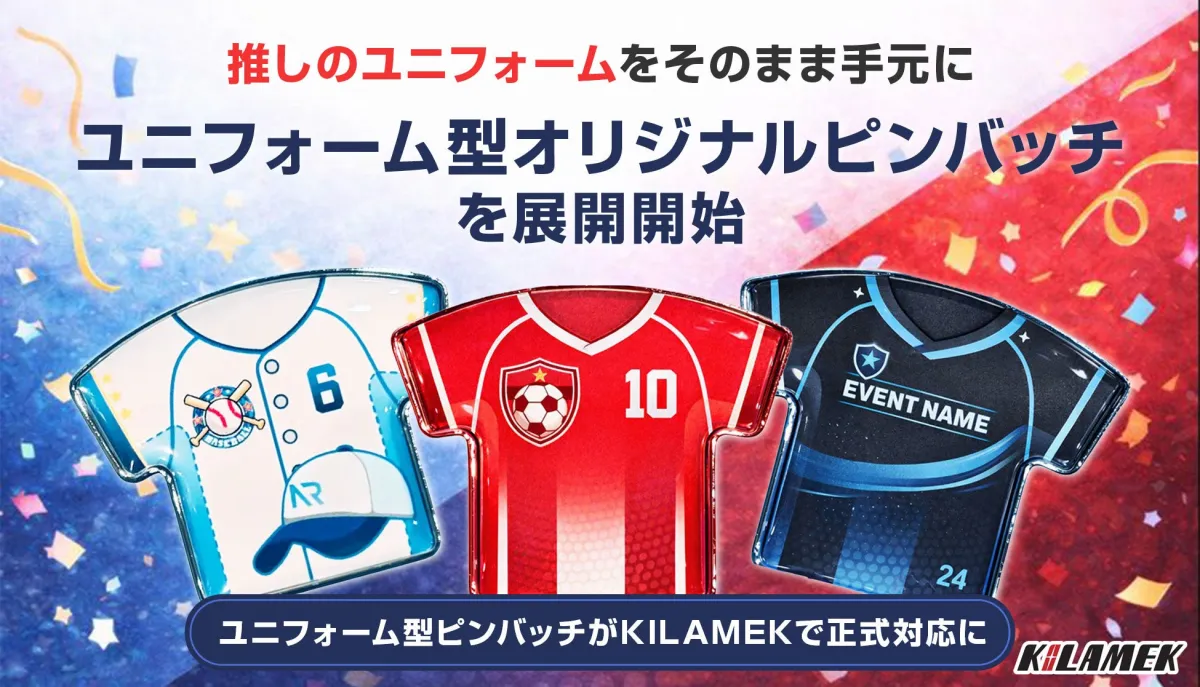 株式会社KILAMEK(東京都新宿区)は、ファンイベントやスポーツ団体向けの「ユニフォーム型オリジナルピンバッチ」の名入れ製作サービスを正式に開始しました。このピンバッチは、チームカラーや衣装デザインを忠実に再現したポップなデザインが特徴で、ファンにとってはたまらないアイテムとなっています。