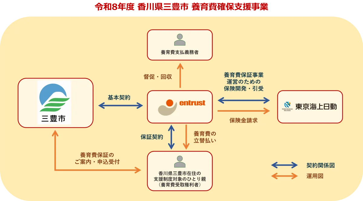 三豊市における養育費保証は、同市に居住するひとり親家庭とイントラストが契約を結ぶ形で運営されます。初年度の保証料は三豊市が負担し、支援が必要な家庭に対して適切な情報提供が行われます。