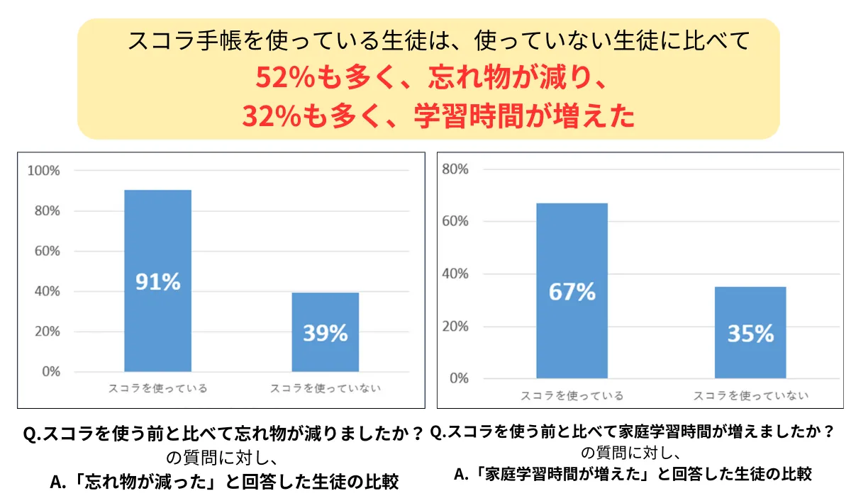 「スコラ手帳を使用することで忘れ物が減った」と答えた生徒は91%。これに対し、手帳を使用していない生徒ではわずか39%でした。