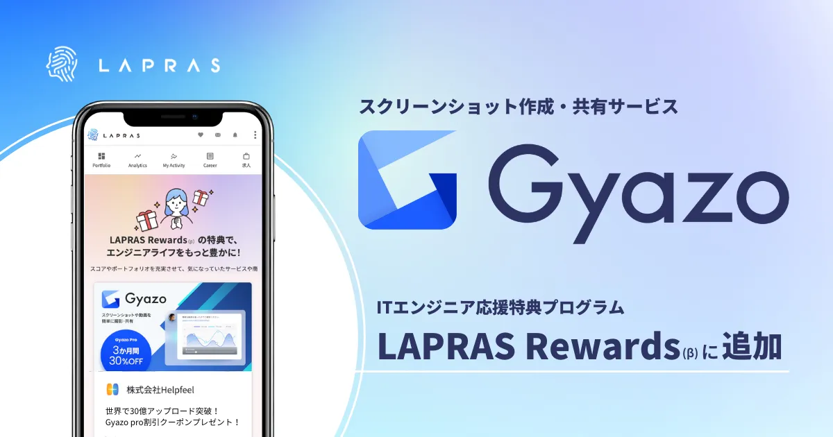 LAPRAS株式会社は、ITエンジニア向けの特典プログラム「LAPRAS Rewards」に、新たに株式会社Helpfeelが運営するスクリーンショット作成・共有サービス「Gyazo」を追加しました。この新しい特典は、エンジニアのアウトプット活動をさらに活性化することを目的としています。