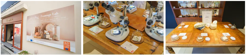 展示エリアでは、チーズに関する視覚的な体験や香りの体験が提供され、来場者たちはまるでフランスでチーズが作られている実験室にいるかのような感覚を味わいました。顕微鏡を使って、ブルー・デ・コースの青カビやコンテのアミノ酸の結晶を観察し、通常目にすることができないチーズの奥深さに触れることができました。また、濃厚なキャラメルの香りを含む5種類のチーズを嗅ぎ比べることで、フランスチーズの知られざる魅力に気づくことができました。