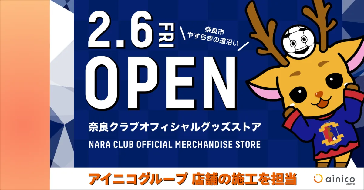 2026年2月6日(金)、奈良クラブのファン待望のオフィシャルストアがオープンします。アイニコグループ株式会社が展開する住宅ブランド「楓工務店」が手がけたこの店舗は、近鉄奈良駅から徒歩3〜5分の場所に位置し、奈良クラブのホームスタジアム「ロートフィールド奈良」を結ぶ重要な導線上にあります。この場所は、試合日だけでなく年間を通じて奈良クラブを応援する“常設の交流拠点”として構築されました。