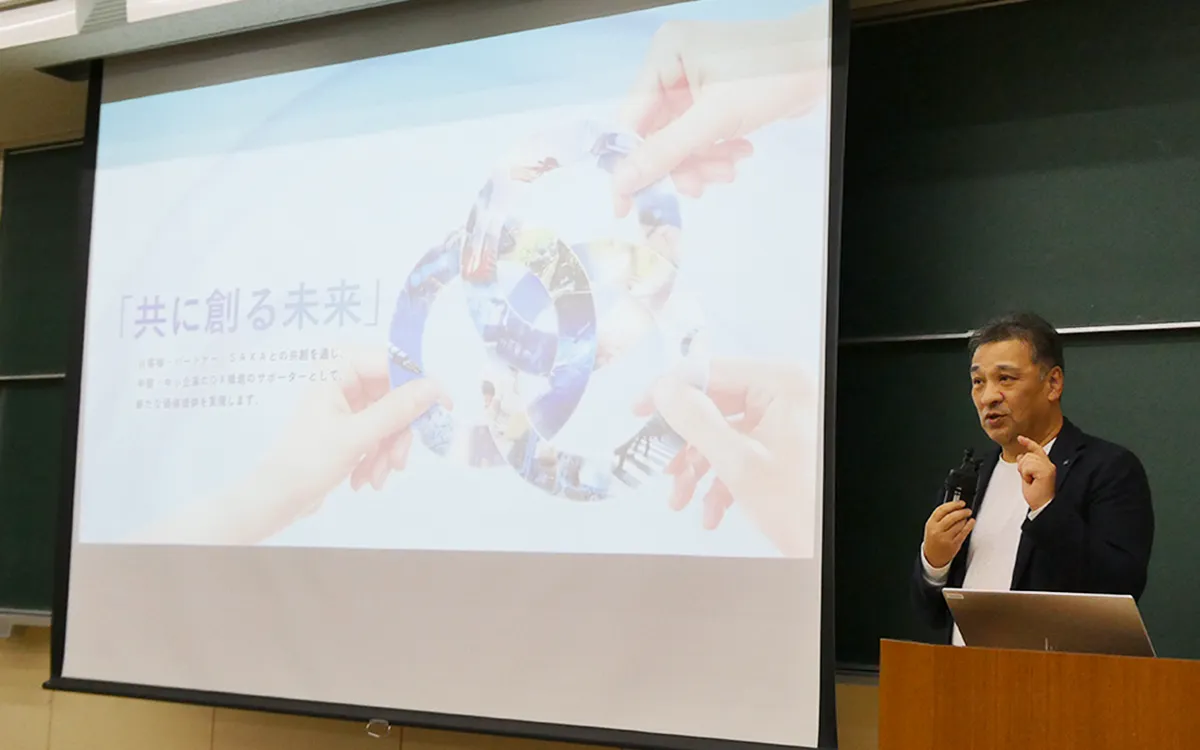 当日、サクサの開発副本部長 高橋徹氏が講演を行い、IT業界の視点から地域産業への貢献や、学生たちが将来どのようにキャリアを形成していくべきかについて貴重な議論を展開しました。高橋氏は、地域に根ざした企業の重要性についても触れ、学生たちが自らの未来に対する具体的なイメージを持てるよう工夫を凝らした内容となりました。