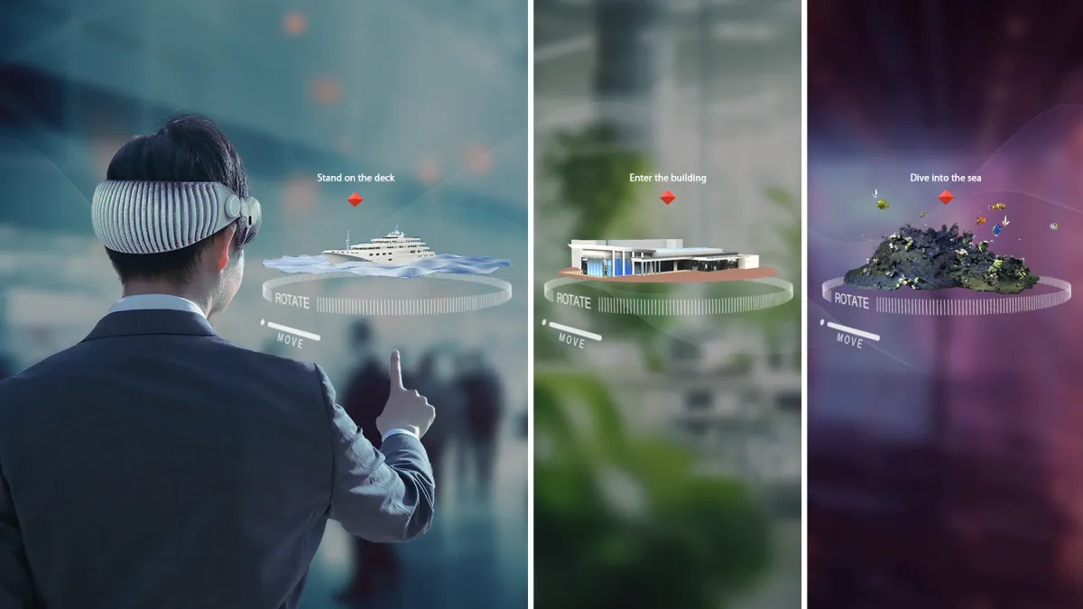 今回のトライアル版で体験できるコンテンツも多彩です。例えば、船の3Dモデルを確認できる「Ship」では、アプリ内のクリスタルをタップすることで船のデッキに立つことができ、海上の世界に没入できます。また、「Building」セクションでは、建物の内部にアクセスすることができ、外観と内観をシームレスに切り替えながら確認できます。