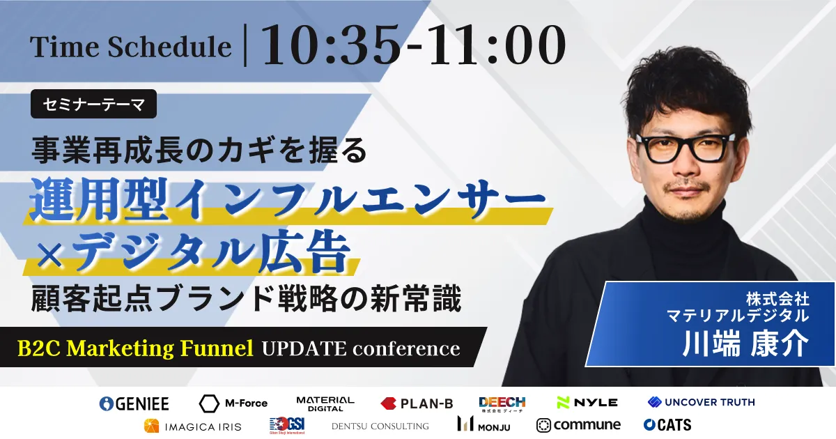 2025年11月11日(火)、株式会社マテリアルデジタルが主催するオンラインセミナー「B2C Marketing Funnel UPDATE conference」が開催されます。このセミナーでは、BtoCマーケティングの最新トレンドを購買ファネル全体の視点から紐解き、具体的な改善策や成果を出すための運用設計について、各領域の専門家たちが実践事例を交えて解説します。