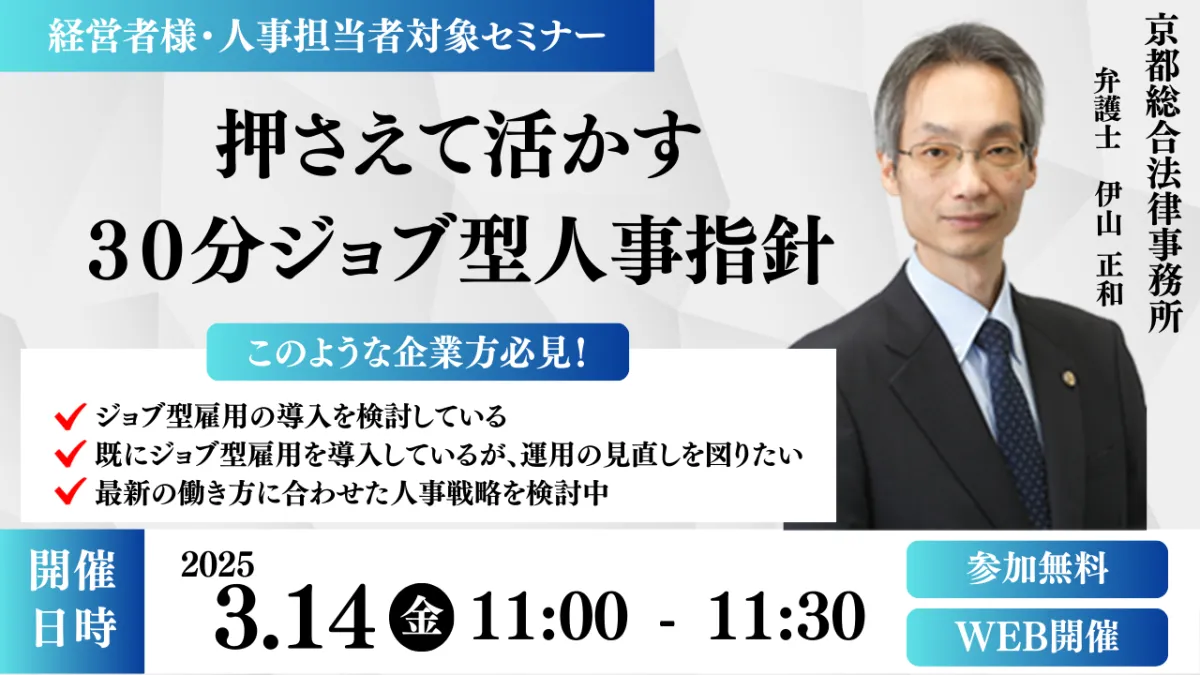 2025年3月14日(金)、京都総合法律事務所が主催する無料オンラインセミナー「押さえて活かす30分ジョブ型人事指針」が開催されます。このセミナーは、企業の経営者を対象に、最新の労務事情や法的留意点を解説する内容となっています。特に、昨年公表された「ジョブ型人事指針」がもたらす変化について、参加者が具体的なメリットと留意点を理解できる貴重な機会です。