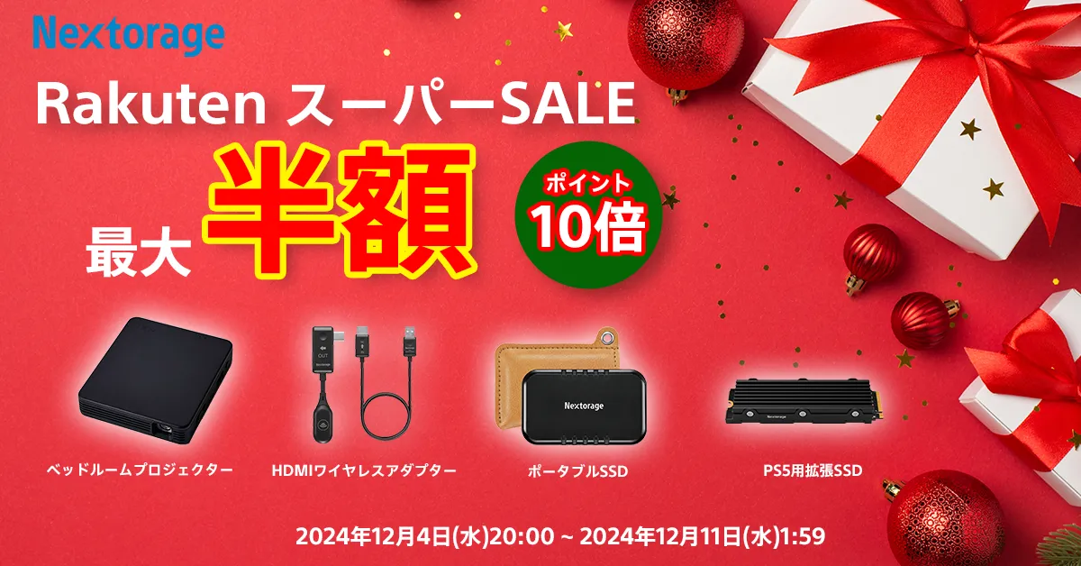 楽天スーパーSALEの期間は、2024年12月4日(水)20:00から12月11日(水)01:59までです。この貴重な機会を逃さず、Nextorage公式ショップの楽天市場店で特別価格の商品をチェックしてください。