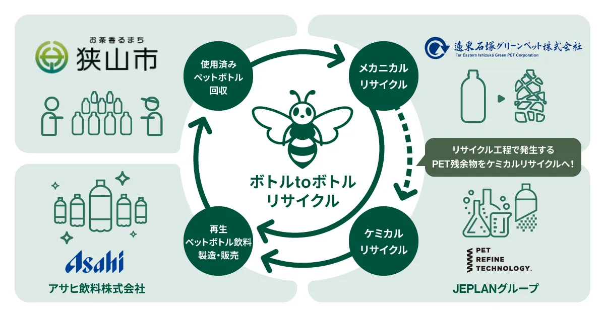 2023年3月25日、埼玉県狭山市において、JEPLANグループの一員であるペットリファインテクノロジーが、アサヒ飲料、遠東石塚グリーンペットと共に「ペットボトルの水平リサイクルに関する協定」を締結しました。本協定は、日本国内におけるペットボトルの循環的利用を促進することを目的としており、各社が協力してリサイクル活動を実施していくことが期待されています。