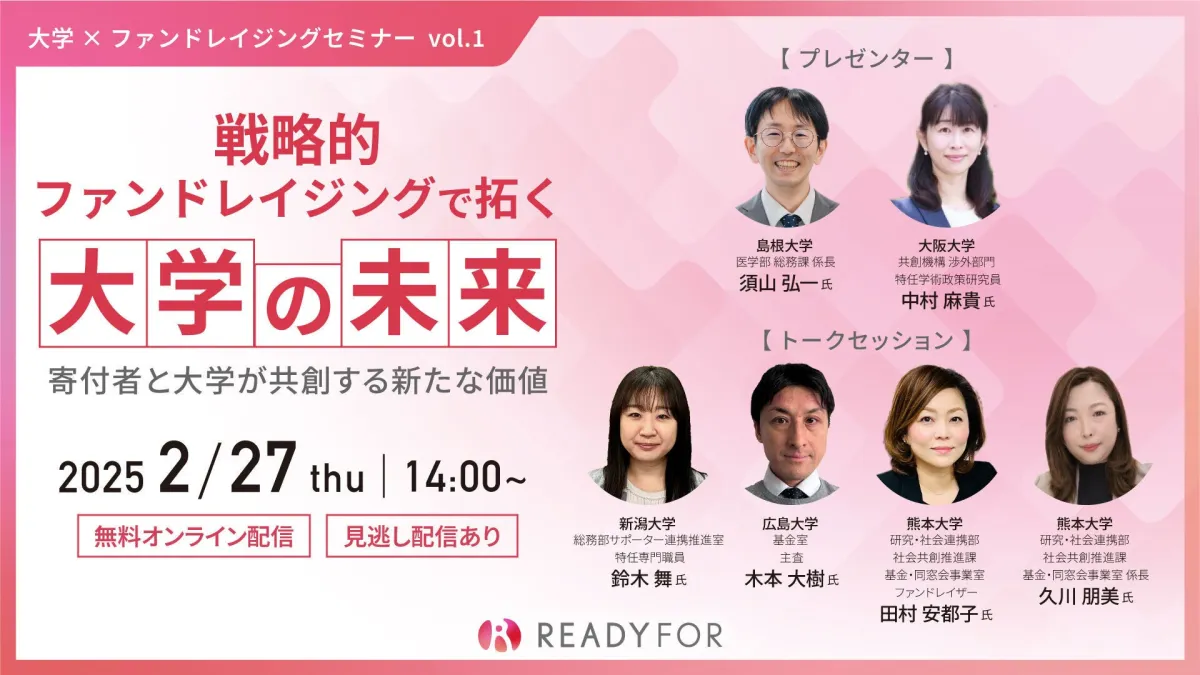 2025年2月27日(木)、日本初のクラウドファンディングサービス「READYFOR」が主催するオンラインセミナー「戦略的ファンドレイジングで拓く大学の未来」が開催されます。このセミナーでは、大学と寄付者が共創する新たな価値の創出をテーマに、現在の大学における資金調達の課題や戦略について話し合います。