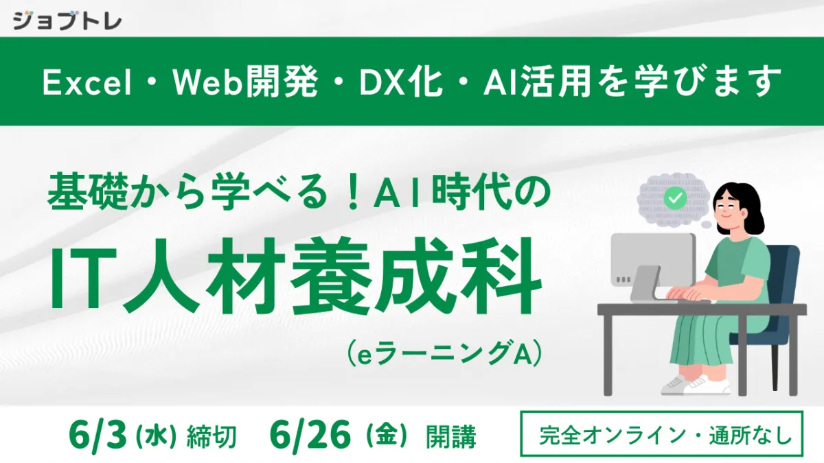 『基礎から学べる!AI時代のIT人材養成科(eラーニングA)』は、厚生労働省から認定されたeラーニング型の求職者支援訓練です。このプログラムは、プログラミングの基本であるExcelの自動化を実現するためのマクロやVBAを通じて、参加者がその基礎を身につけることを可能にします。