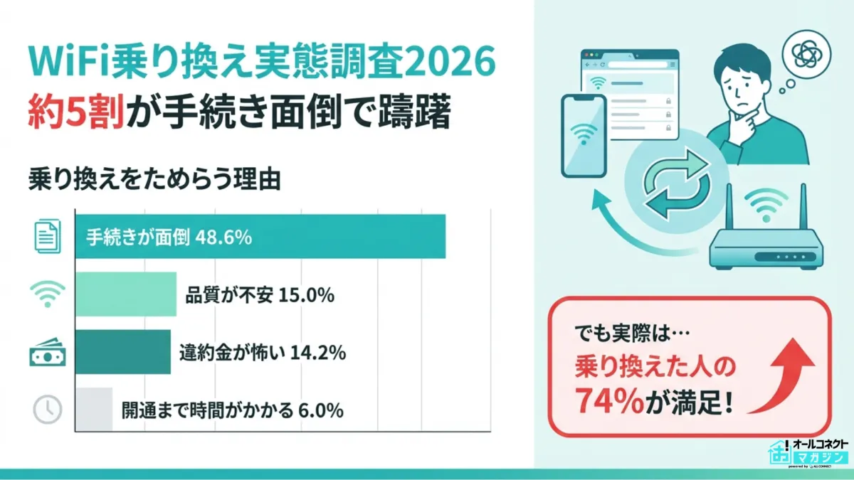WiFiの乗り換えを考える理由として最も多かったのは「速度や品質に不満がある」という35.4%でした。価格面での不満も27.0%の人々が挙げており、速度や料金が乗り換えを行う主な動機となっています。しかし、興味とは裏腹に乗り換えをためらう理由も明らかでした。その中で最も大きな障壁として「手続きが面倒」という回答が48.6%と圧倒的に多く、金銭的な理由(違約金や解約金)を上回る結果となっています。