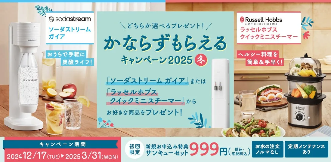 水を通じて生活や健康をサポートするアクアクララ株式会社が、冬の新たなキャンペーンを発表しました。2024年12月17日から2025年3月31日までの期間中、アクアクララに新規で入会すると、ソーダストリームの「ソーダストリーム ガイア」または、ラッセルホブスの「クイックミニスチーマー」のいずれかをプレゼントします。