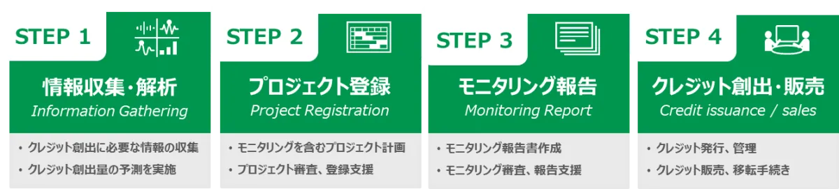日立システムズは、情報収集やクレジット創出量の算出、プロジェクト登録、モニタリング報告そして最終的な販売までの一連のプロセスを支援します。これにより企業は、J-クレジットの創出を効率的に進めることが可能となり、地域の金融機関との連携を通じてクレジットの販売も実現します。