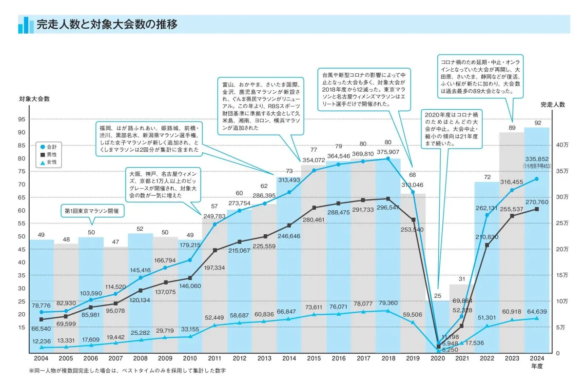 特筆すべきは、コロナ禍によって一時期大会が中止され、2020年度には完走者数がわずか1万1,198人に減少した事実ですが、その後の回復は目覚ましく、2021年度からは6万9,864人、2022年度には26万2,131人、2023年度には31万6,455人と、着実に増加を続けています。ことしは大会数も増え、完全にコロナ前の水準を超える結果となりました。