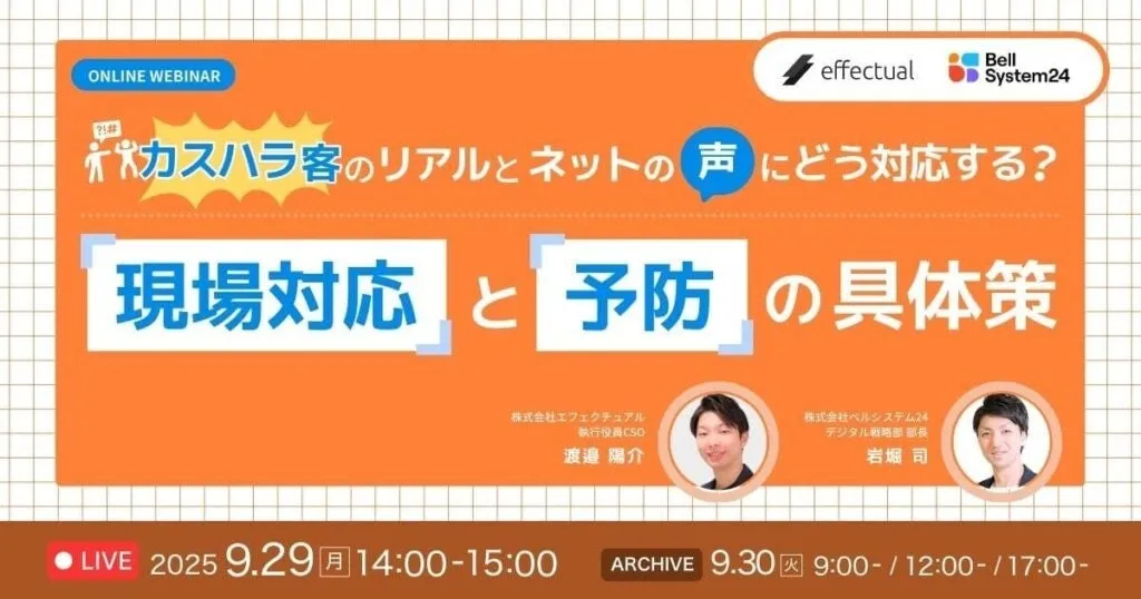 2025年9月29日、株式会社ベルシステム24と株式会社エフェクチュアルは、カスハラ被害とそれに伴うSNSの拡散が企業に及ぼすリスクに対処するためのオンラインセミナーを開催します。このセミナーの参加は無料で、興味のある方は事前に登録を行う必要があります。