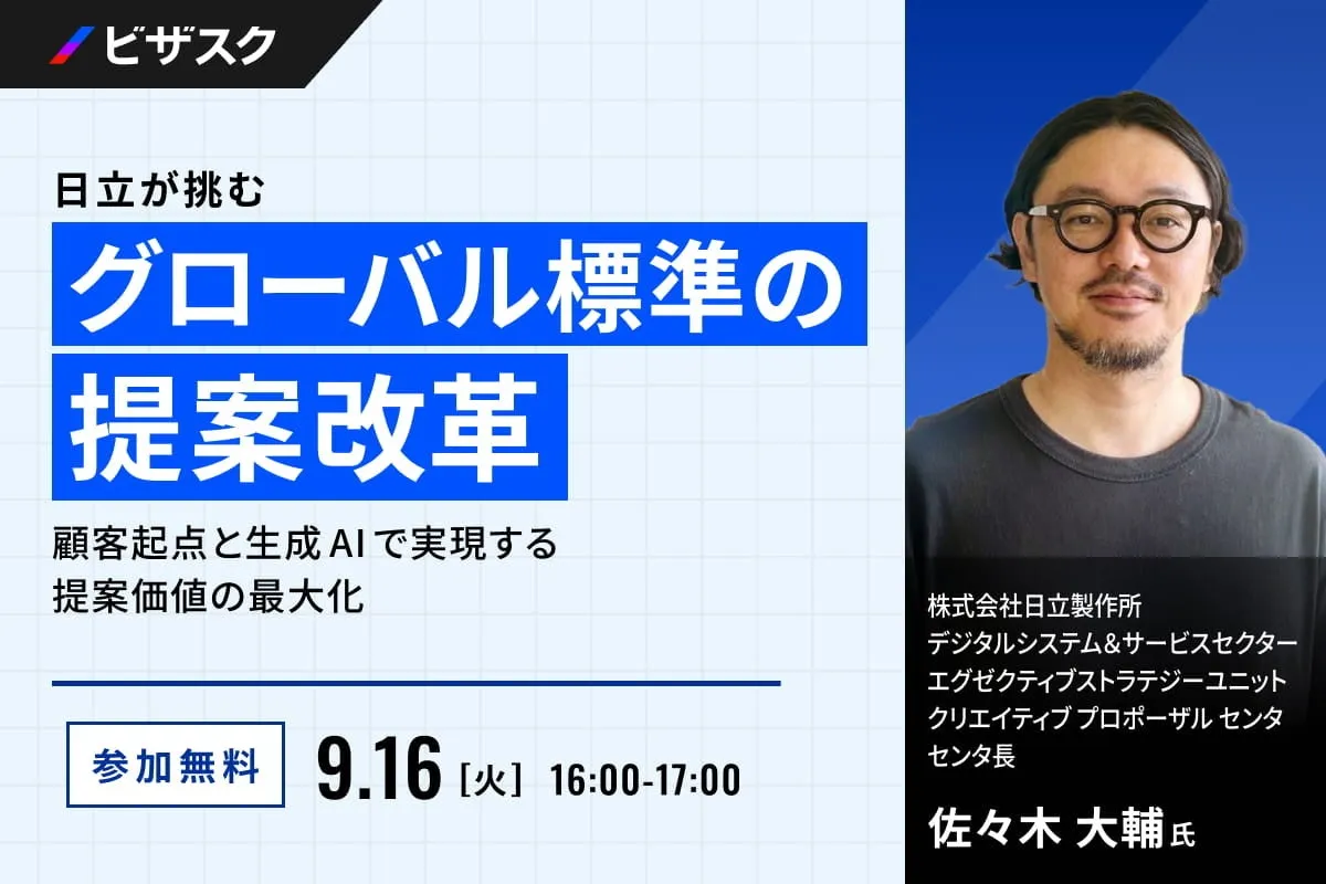 2023年9月16日、株式会社ビザスクが主催する無料のオンラインセミナーが開催されます。このセミナーでは、株式会社日立製作所の佐々木大輔氏が登壇し、テーマは「顧客起点と生成AIで実現する提案価値の最大化」です。