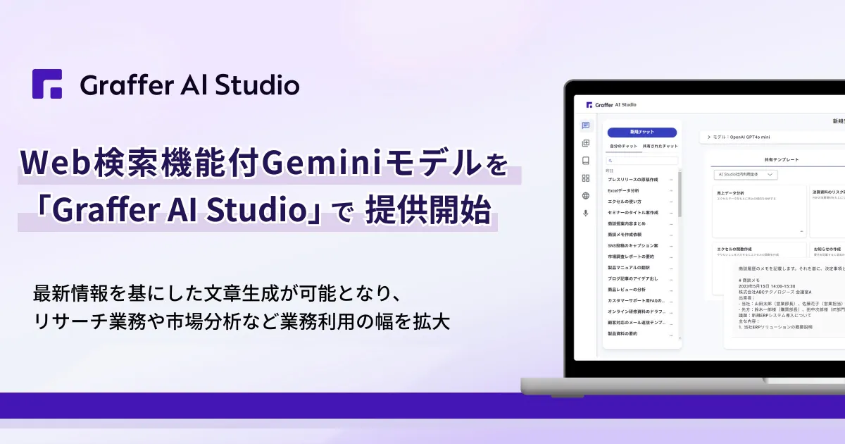 株式会社グラファーは、生成AIを活用した企業向けプラットフォーム「Graffer AI Studio」にWeb検索機能を搭載したGeminiモデルの提供を開始しました。この新たな機能により、生成AIは最新情報に基づいた文章生成が可能になります。特にリサーチ業務や市場分析において、企業はより迅速で正確な意思決定ができるようになるでしょう。