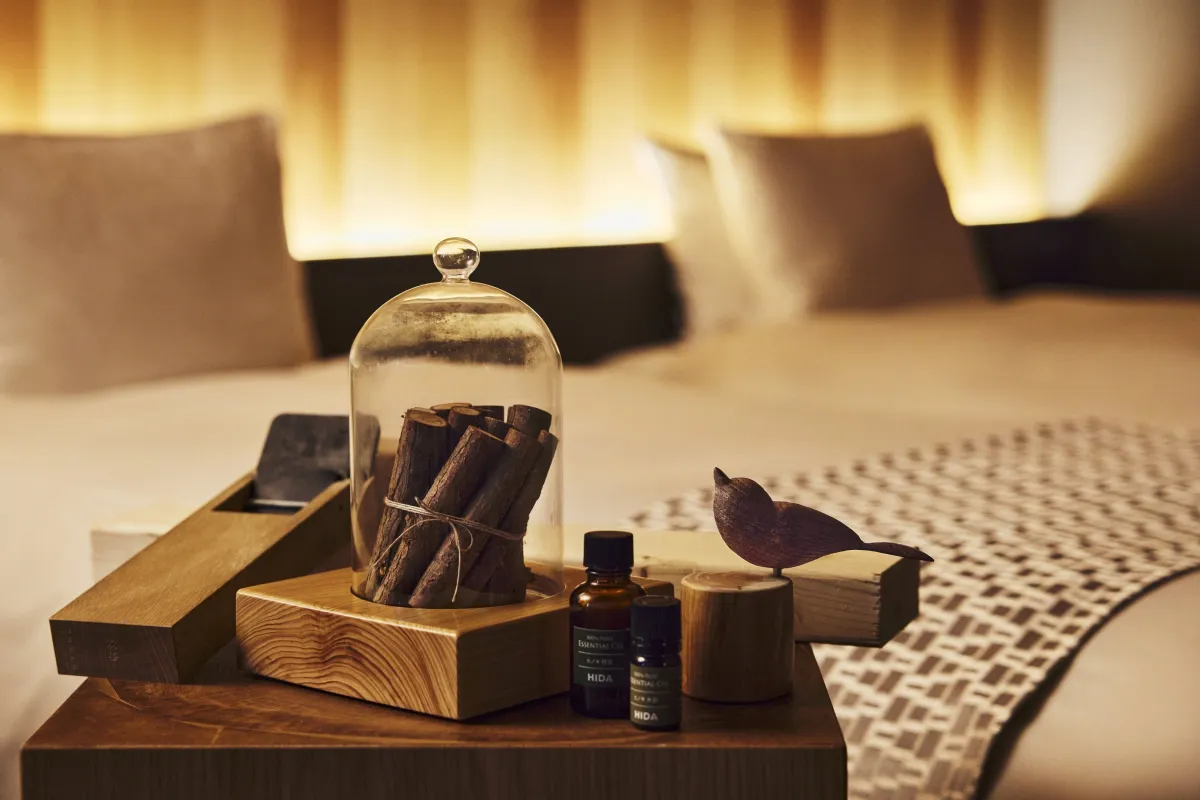 就寝前には、飛騨の木工文化が息づく「飛騨MOKUの間」で、飛騨家具に囲まれたリラックス空間を体験。飛騨産の4種のエッセンシャルオイルを試し、お気に入りを見つけて心地よい香りで眠りを整えます。