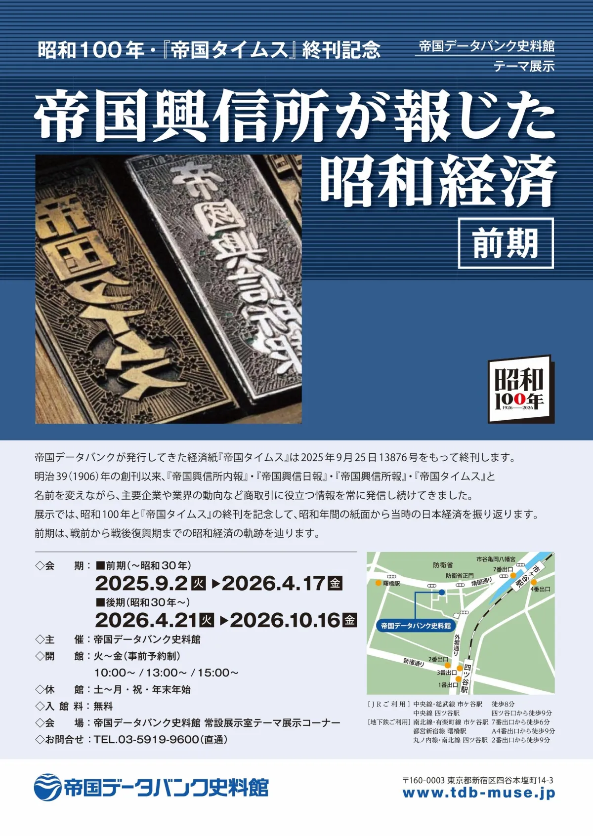 帝国データバンクが運営する帝国データバンク史料館で、企画展「帝国興信所が報じた昭和経済(前期)」が2025年9月2日よりスタートします。この展示は、昭和100年を迎えるのを機に、また経済紙『帝国タイムス』の終刊を記念するものです。