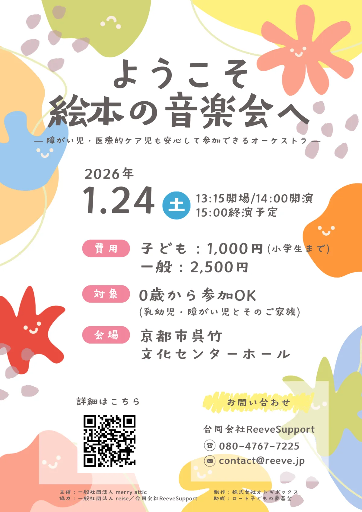 2026年1月24日(土)、京都市にて「ようこそ 絵本の音楽会へ」という音楽イベントが開催される。このイベントは、医療的ケア児や障がい児、その家族が参加できるよう特別に配慮されている。主催は一般社団法人merry attic、制作を担当するのは株式会社オトギボックスであり、この取り組みに合同会社ReeveSupportが協力している。
