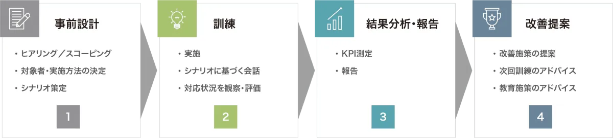 この訓練プログラムは、攻撃者が使う手法の理解を深めるために、様々なシナリオを用意しています。受講者は、模擬的な電話対応を通じて、実践的かつ効果的にボイスフィッシングへの耐性を強化することが目指されます。また、訓練後には詳細な報告書が提供され、受講者の応対状況や傾向を分析。さらなる課題を可視化し、継続的なセキュリティ強化を支援します。