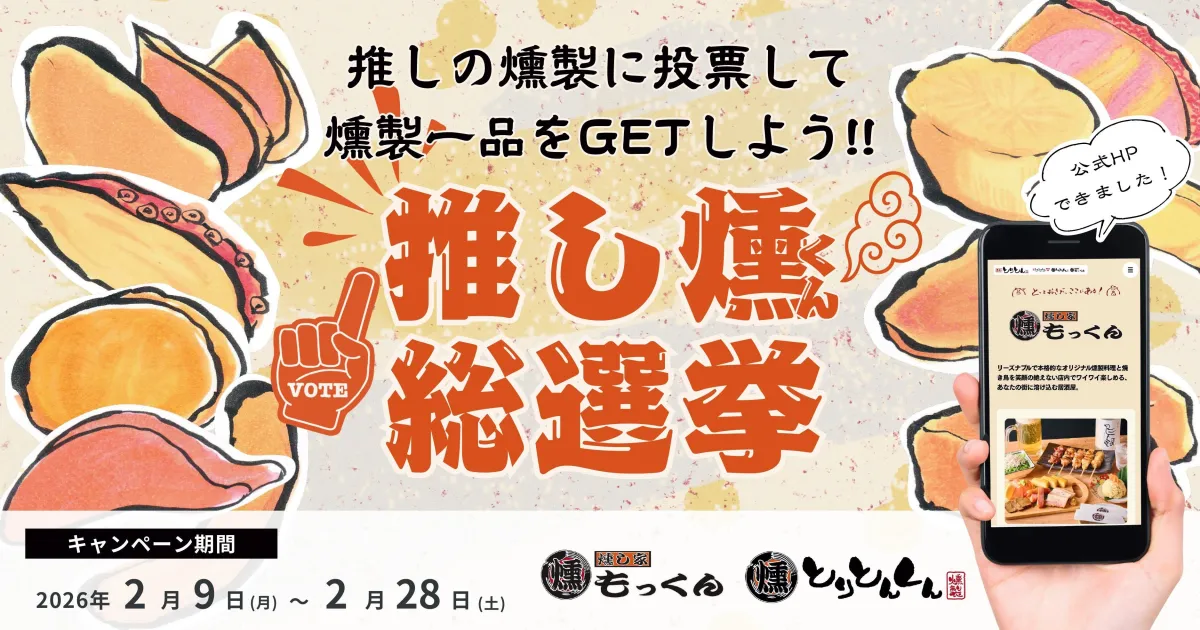 東京都を中心に展開している本格燻製居酒屋、「燻し家もっくん」と「とりとんくん」が2026年2月9日から28日までの期間、特別なキャンペーン「推し燻(くん) 総選挙」を開催します。この企画は、燻製料理の魅力を多くの人々に伝えるための参加型キャンペーンです。