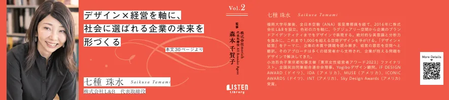 最近、七種さんは新書『女性リーダーたちのMY LIFE Story Vol.2』に寄稿しました。この書籍では、空間デザインと経営の関係についての洞察が語られています。彼女は「デザインは贅沢ではなく、未来への戦略投資である」とし、デザインを経営資源としてどう活用するかについて自身の経験を通して述べています。