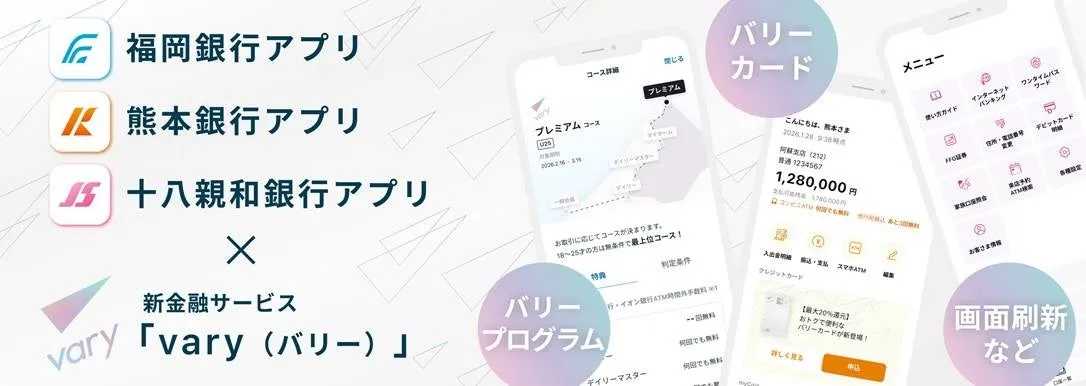 株式会社ふくおかフィナンシャルグループ(FFG)が提供する「福岡銀行アプリ」「熊本銀行アプリ」「十八親和銀行アプリ」に新たな機能が追加されました。これにより、お客さまは新たな金融サービス「vary(バリー)」の提供を受けることができ、利用の幅が広がります。