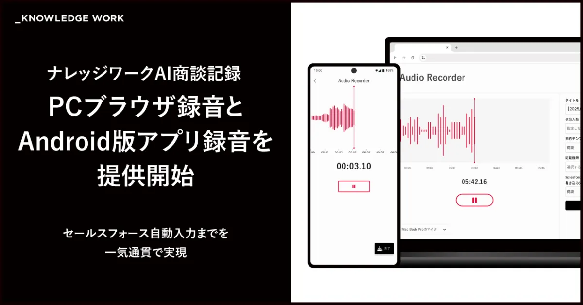 株式会社ナレッジワーク(本社:東京都港区)は、セールスイネーブルメントAI「ナレッジワーク」の主要プロダクトである「ナレッジワークAI商談記録」を進化させた。新たにPCブラウザ録音機能が追加され、対面商談の録音が可能になったほか、Android版のアプリも新たに提供され、より多様な営業現場での利用が実現した。