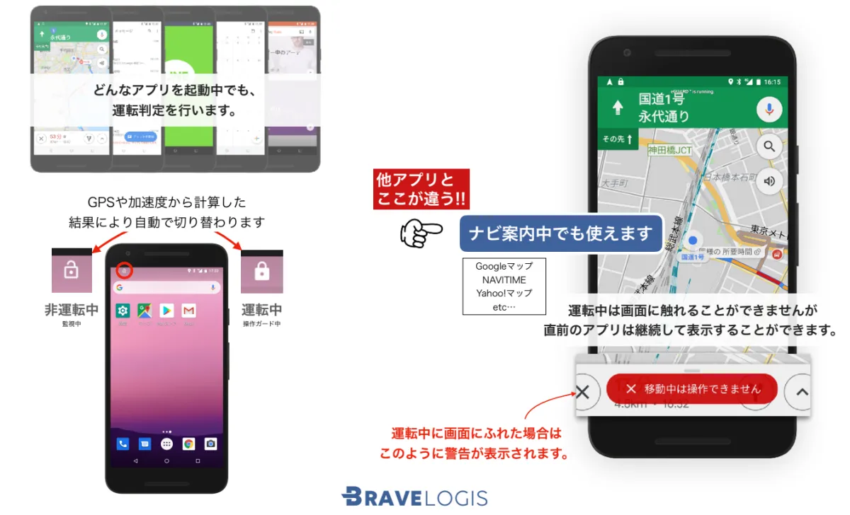 画面操作が無効化されている間も、アプリは稼働し続け、着信がある場合でも、単に表示されるだけなので通話によるながら運転を防げる仕組みになっています。