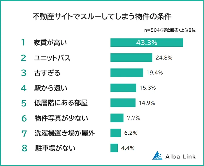 賃貸物件を探す際、多くの方は不動産サイトを利用しますが、どのような条件を重視して物件を見ているのでしょうか。株式会社AlbaLinkが実施した調査によれば、504人の回答者が選ぶ「不動産サイトでスルーしてしまう物件の条件」に基づくランキングが明らかになりました。さっそくその詳細を見ていきましょう。