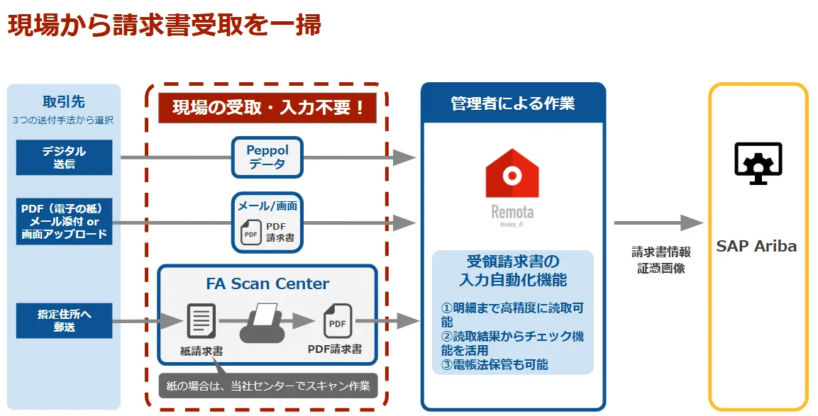 ファーストアカウンティングが開発した「Remota for SAP Ariba」は、AIによる請求書データの自動読み取りを実現したシステムです。このシステムは、SAP Aribaを利用する企業に対して、受領した請求書の入力作業を大幅に省略し、調達・購買業務のスピードと正確性を高めることを目指しています。特に、請求書処理の自動化により、法令対応や内部統制の強化を手助けすることが可能です。