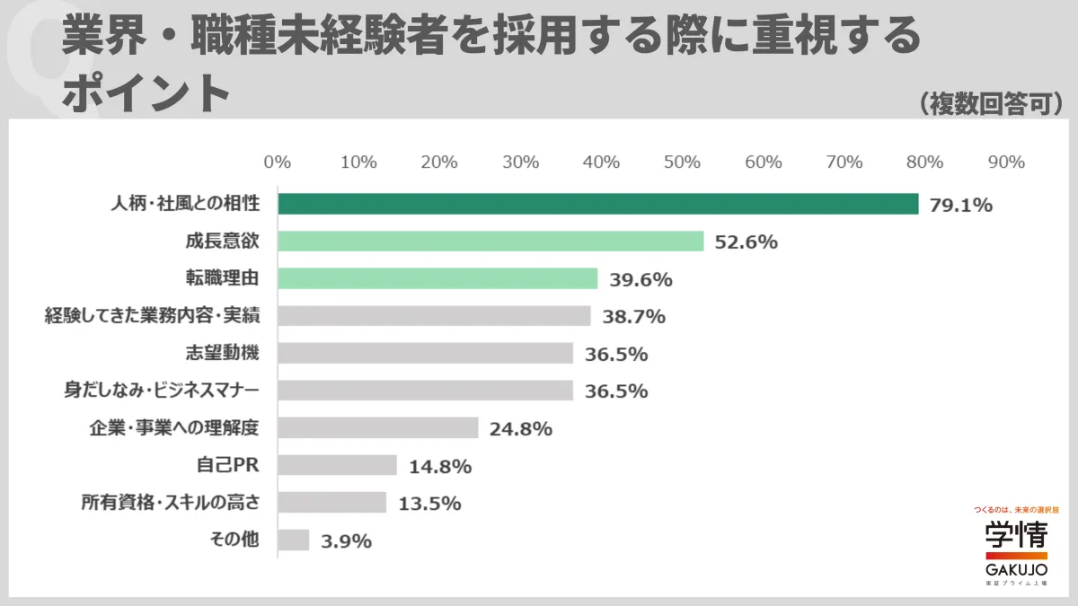 調査結果によると、業界・職種未経験者の採用において評価されるポイントは以下の通りです。
