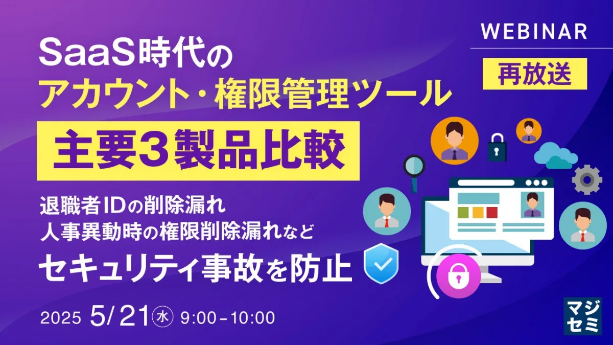 2024年9月4日(水)に開催されるウェビナー『SaaS時代のアカウント・権限管理ツール、主要3製品比較』が、再放送されることになりました。昨今のビジネスシーンでは、テレワークの普及に伴い、様々なクラウドサービスを使う企業が増えています。特に、Microsoft 365やGoogle Workspace、Salesforce、Slack、Zoom、そして経費精算や勤怠管理に至るまで、それぞれの業務に特化したサービスが多数存在します。