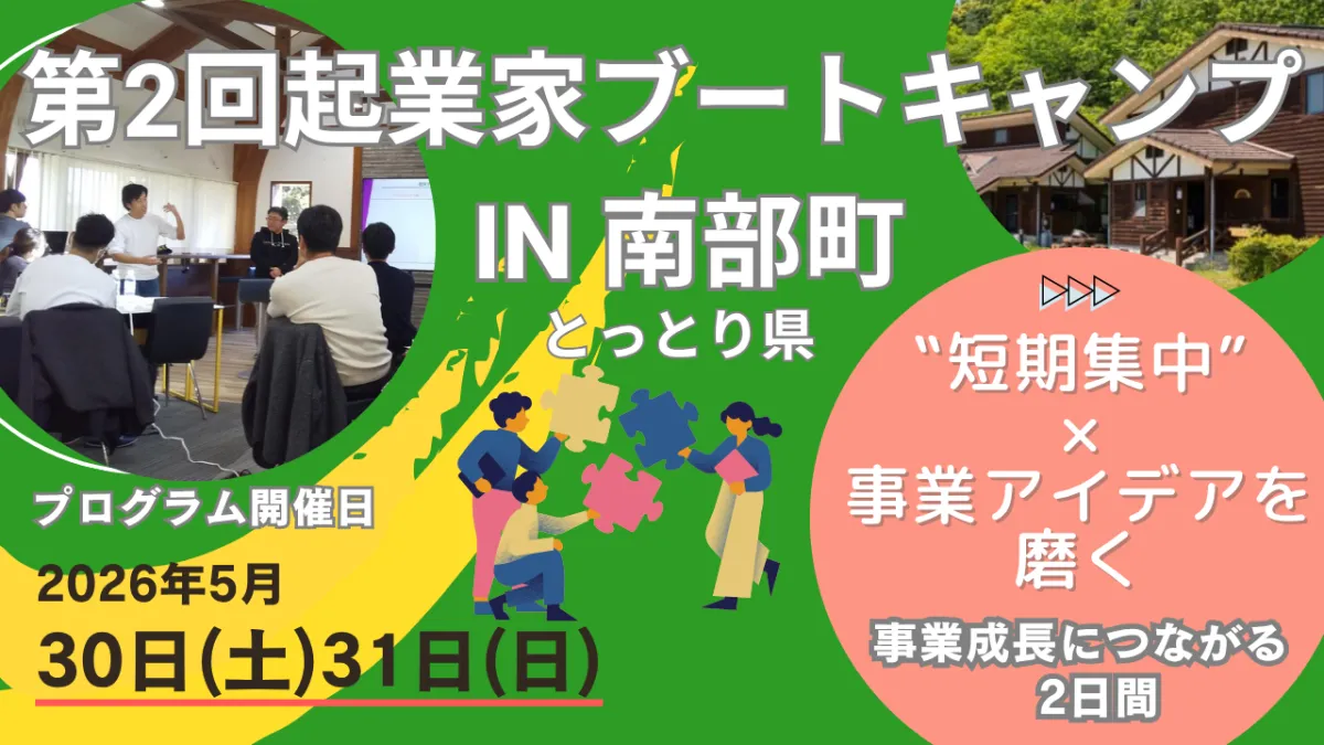 2026年5月30日と31日の2日間、鳥取県西伯郡南部町で地方ビジネスに特化した実践的な宿泊イベント「第2回起業家ブートキャンプ」が開催されます。主催は、株式会社AGORAとGOB株式会社。このイベントは、地域での事業展開を考える起業家や地域おこし協力隊のメンバーを対象にしています。