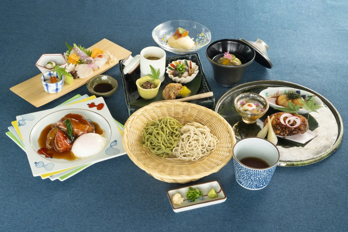 メインには、淡路牛の冷やしすき焼きがあり、細やかな霜降り肉の甘さと香りを楽しむことができます。これは、山椒の爽やかな刺激によって、食欲を引き立てる素晴らしいバランスです。また、特製の変わり蕎麦には、海藻“アカモク”と、ミネラル豊富な“長命草”を取り入れており、色合いや風味を楽しむことができます。