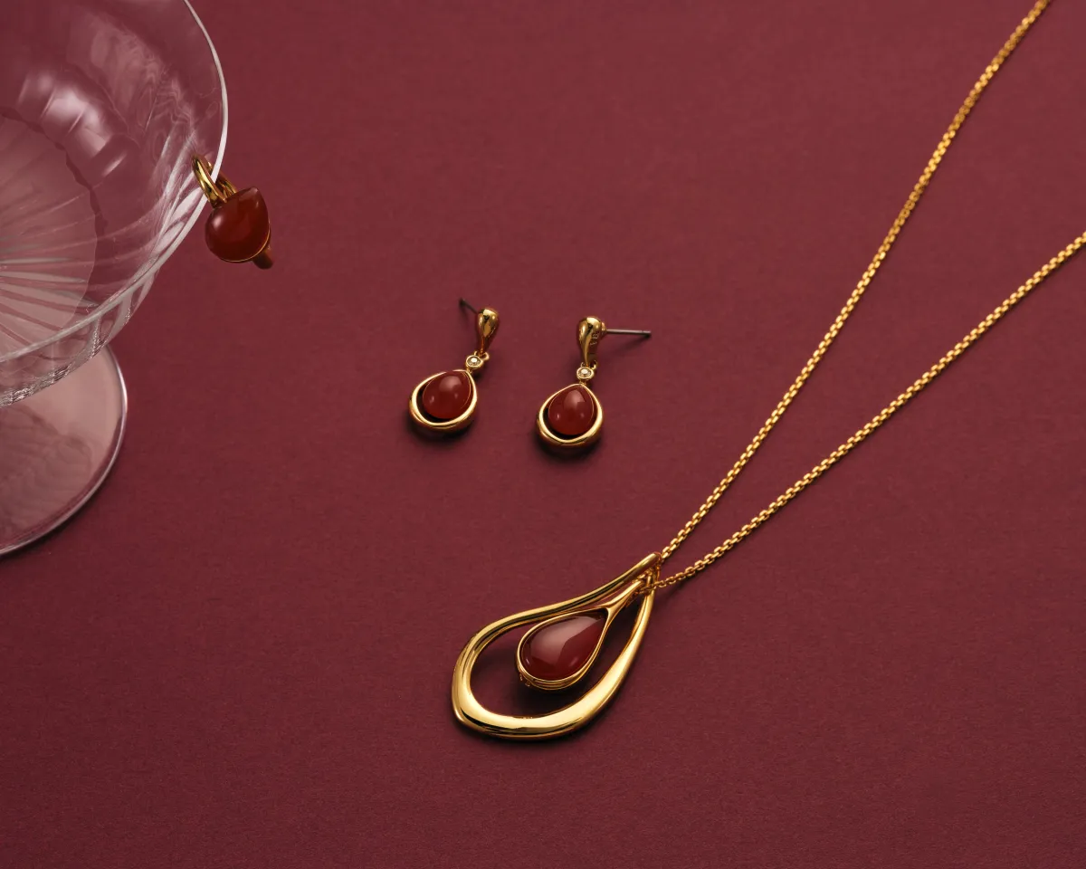 新作の中でも特に注目されているのは、カーネリアンを用いたアクセサリーです。美しいバーガンディーレッドの輝きが、まるで秋の深まりを感じさせてくれます。ネックレスは税込み33,000円で、光の当たり方によって異なる表情を見せるリバーシブルデザインが特徴です。また、シャンパンカラーのカットガラスが使用されており、華やかさを添えています。これに加えて、チェーンネックレスも26,400円で展開されており、コーディネートの幅を広げてくれます。