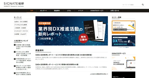 そのような背景から、SIGNATEは「SIGNATE総研」を立ち上げ、多面的な情報発信を通じてDX推進を支援することを目指しています。このプラットフォームでは、企業におけるDX人材の育成や、生成AIの活用事例を中心に、さまざまな情報を中立的な視点から提供していきます。