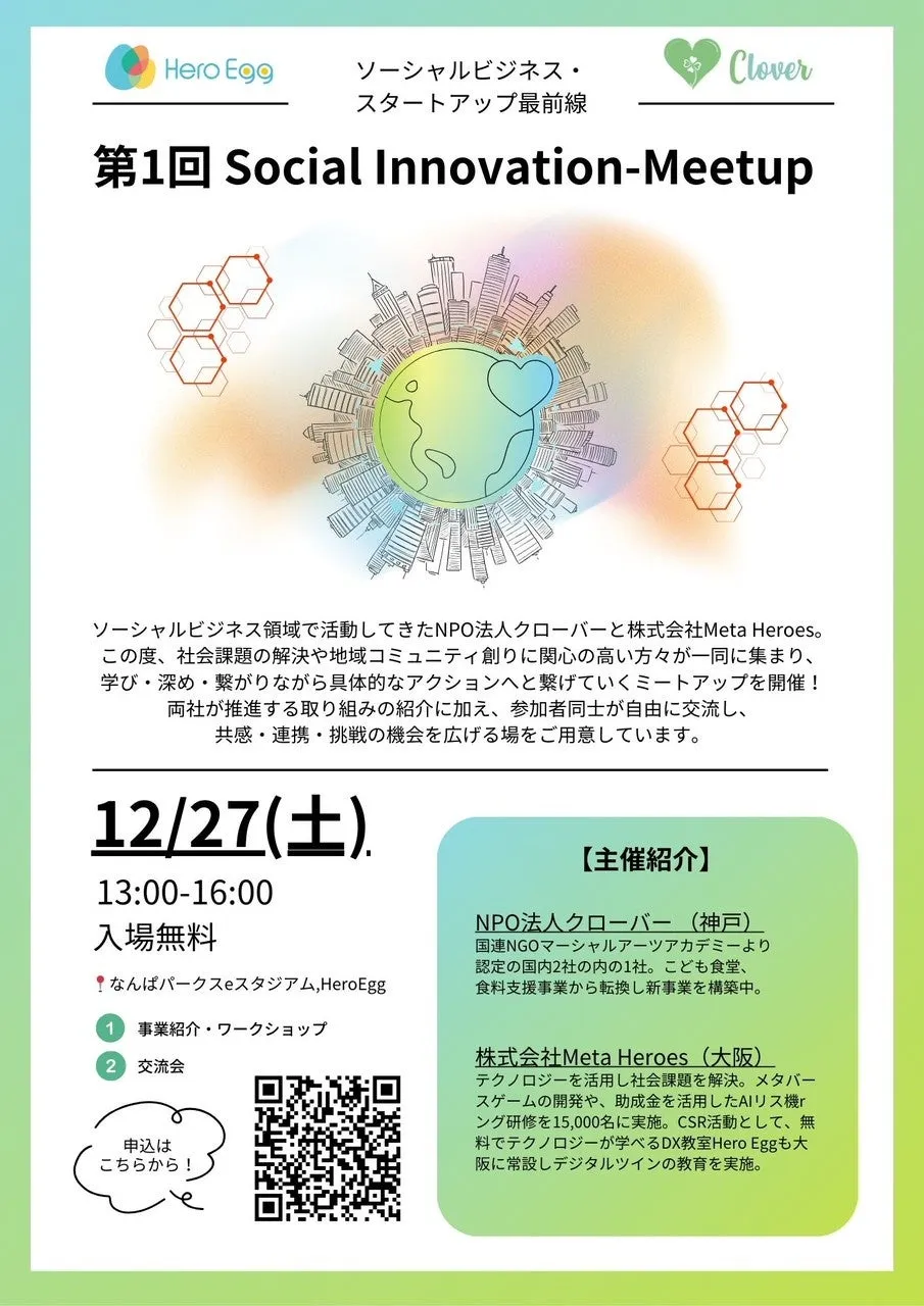 株式会社Meta Heroesが2025年12月27日、NPO法人クローバーとのコラボレーションで「第1回 Social-Innovation Meetup」を大阪の「Hero Egg」で開催します。このイベントは、企業がSDGsや社会貢献活動を具体的に始めるためのサポートを目的としています。