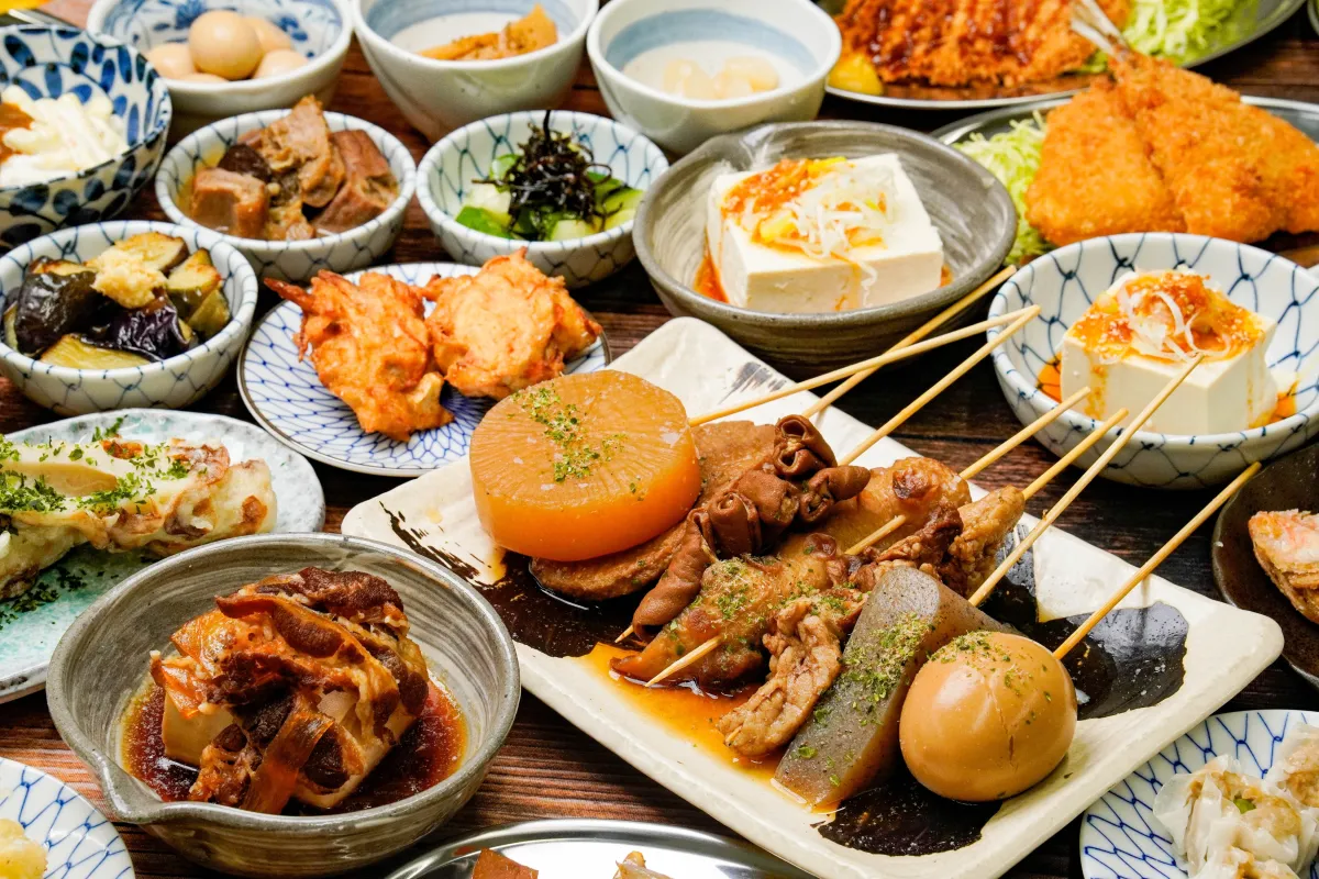 名物の静岡おでんは、大正時代から親しまれている伝承の味。しっかりとした味わいの黒いスープに、串で刺さった黒はんぺんなどの具材が特徴です。お好みで青のりやダシ粉をかけて、自分好みの味を楽しめます。