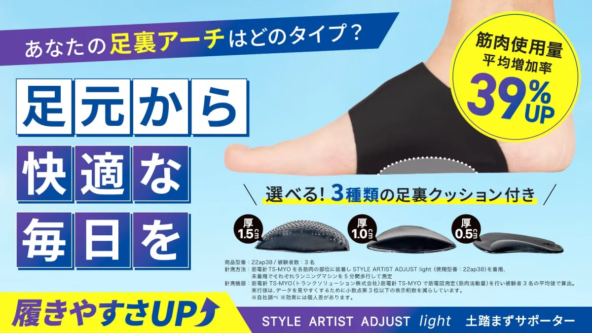 足の健康が今、日常生活に影響を与える時代が到来しています。そんな中、株式会社tsumugiが新たに開発したサポーター『STYLE ARTIST ADJUST light』が注目を集めています。3種類の選べる土踏まずクッションを採用することで、個々の足裏アーチにぴったりフィットし、装着時の筋肉使用量を増やすことができるのです。