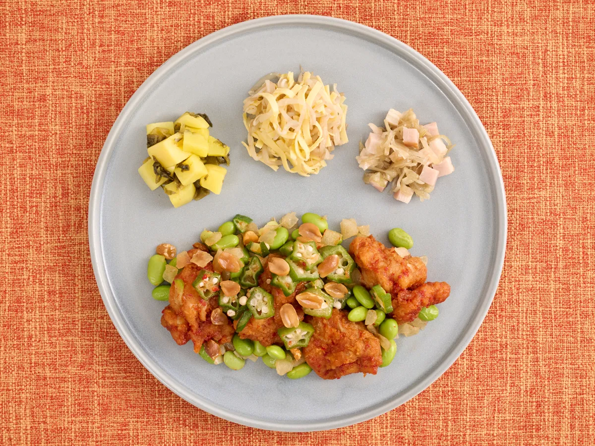 さらに、トッピングにはオクラやピーナッツを使用し、夏の彩り豊かな見た目に仕上げています。これに加えて、枝豆とオニオンスライスが使用され、爽やかな風味がプラスされています。飽きが来ない工夫が施されており、最後までおいしさを楽しめる内容となっています。