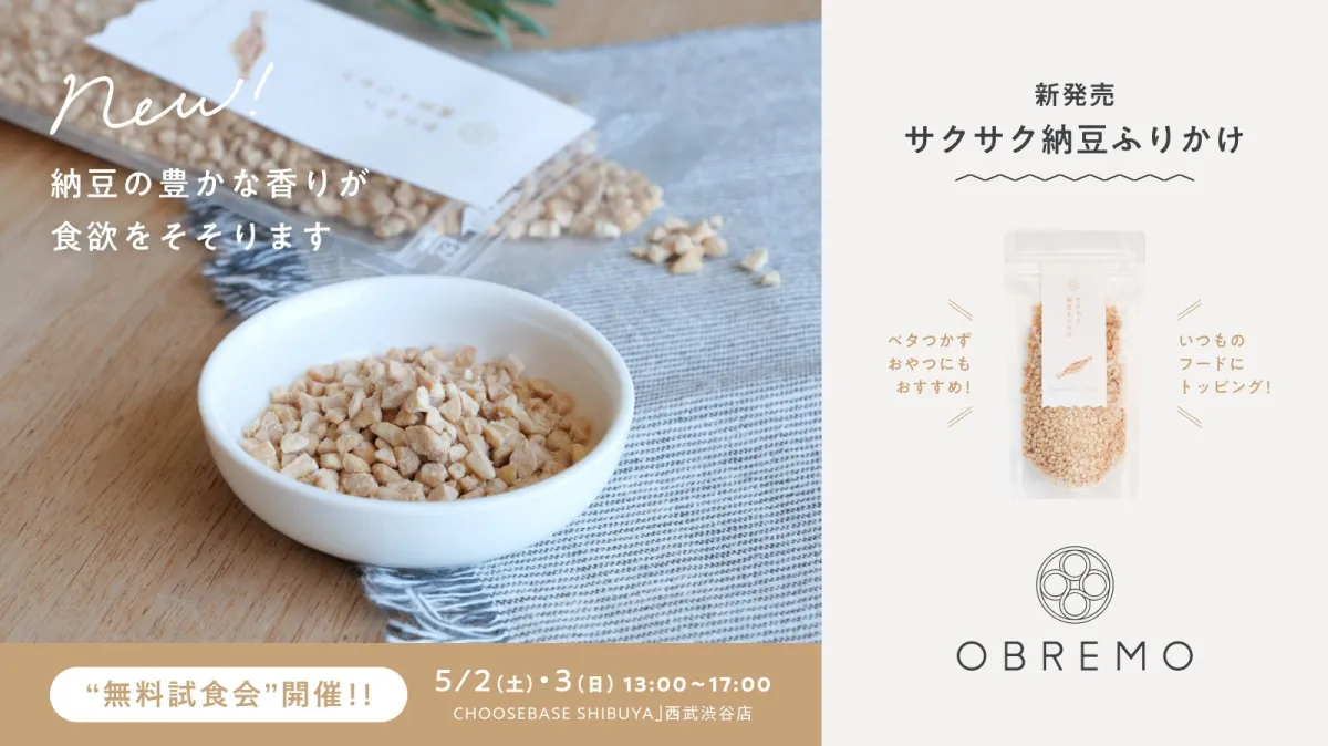 愛犬の食事をもっと楽しむための新商品、OBREMOの「サクサク納豆ふりかけ」が2026年4月23日(木)に公式オンラインストアで発売されます。これは、愛犬の食べムラやお腹の健康に特化した新たなトッピングです。本商品は群馬県の納豆専門店との共同開発により誕生しました。
