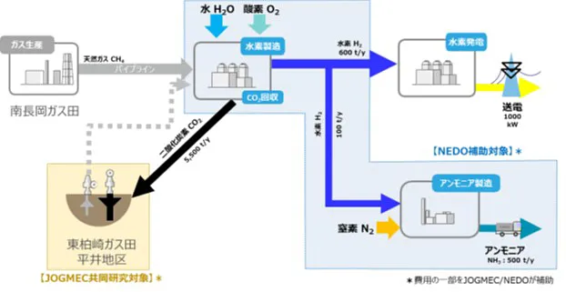 柏崎水素パークでは、INPEXが南長岡ガス田からの天然ガスを利用しています。天然ガスを使用して、水素とアンモニアを合理的に製造し、同時に副生成物であるCO2は安全に管理されます。そのため、これまでのエネルギー生産方式とは一線を画する新しい技術が導入されています。特に、回収したCO2を枯渇したガス田に圧入することで、より持続可能なエネルギー生産が可能になるのです。